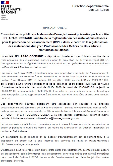 Une consultation du public est demandée par la Société SPL ARAC OCCITANIE au titre de la réglementation des installations classées pour la protection de l’environnement (ICPE), dans le cadre de la régularisation des installations du Lycée Professionnel des M2tiers du Bois située à Montauban-de-Luchon.