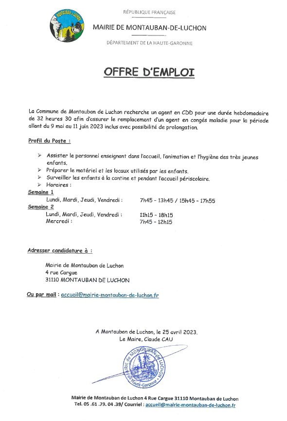 OFFRE D’EMPLOI Publié le 28 avril 2023 par Muriel DEJOUS http://www.mairie-montauban-de-luchon.fr/wp-content/uploads/2023/04/Offre-demploi.pdf