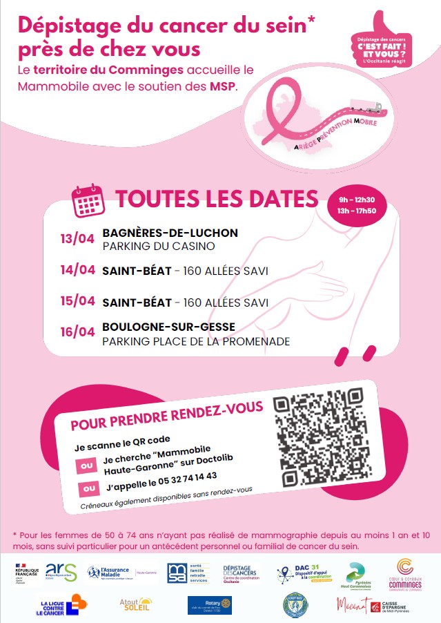 MAMMOBILE – DÉPISTAGE DU CANCER DU SEIN Publié le 26 mars 2026 par Muriel DEJOUS http://www.mairie-montauban-de-luchon.fr/wp-content/uploads/2026/03/affiche-territoire.pdf